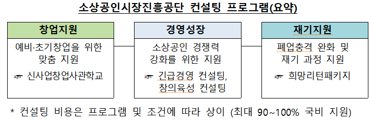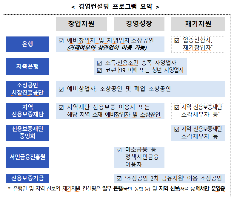 β κΈμ΅κΆκ³Ό κ³΅κ³΅κΈ°κ΄ λ±μ μ°½μ μ§μ, κ²½μμ±μ₯, μ¬κΈ°μ§μ λ± λ¨κ³λ³λ‘ λ€μν κ²½μ컨μ€ν νλ‘κ·Έλ¨μ μ΄μνκ³ μμ΅λλ€,