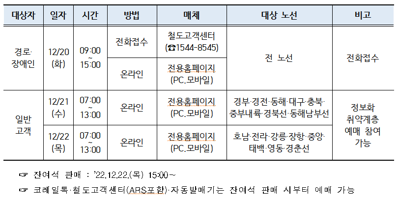 โ–ถ ํŒ๋งค๋˜์ง€ ์•Š์€ ์ž”์—ฌ์„์€ ์ด๋‹ฌ 22์ผ 15์‹œ๋ถ€ํ„ฐ ํ™ˆํŽ˜์ด์ง€·์ฝ”๋ ˆ์ผํ†ก·์—ญ ์ฐฝ๊ตฌ ๋“ฑ ์˜จ·์˜คํ”„๋ผ์ธ์—์„œ ์ผ๋ฐ˜ ์Šน์ฐจ๊ถŒ