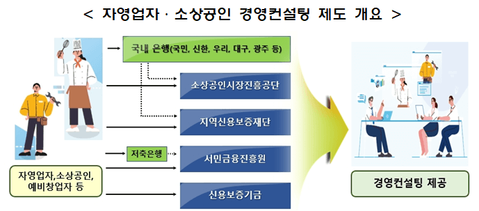 은행이 λŒ€μƒμžλ₯Ό μ„ μ •ν•˜μ—¬ ν˜‘μ•½κΈ°κ΄€(μ†Œμ§„κ³΅, 지역신보 λ“±)에 μ‹ μ²­ν•˜λ©΄, ν˜‘μ•½κΈ°κ΄€μ˜ μ»¨μ„€νŒ… ν”„λ‘œκ·Έλž¨μ„ 톡해 λ§žμΆ€ν˜• μ»¨μ„€νŒ…μ„ μˆ˜ν–‰ν•©λ‹ˆλ‹€.